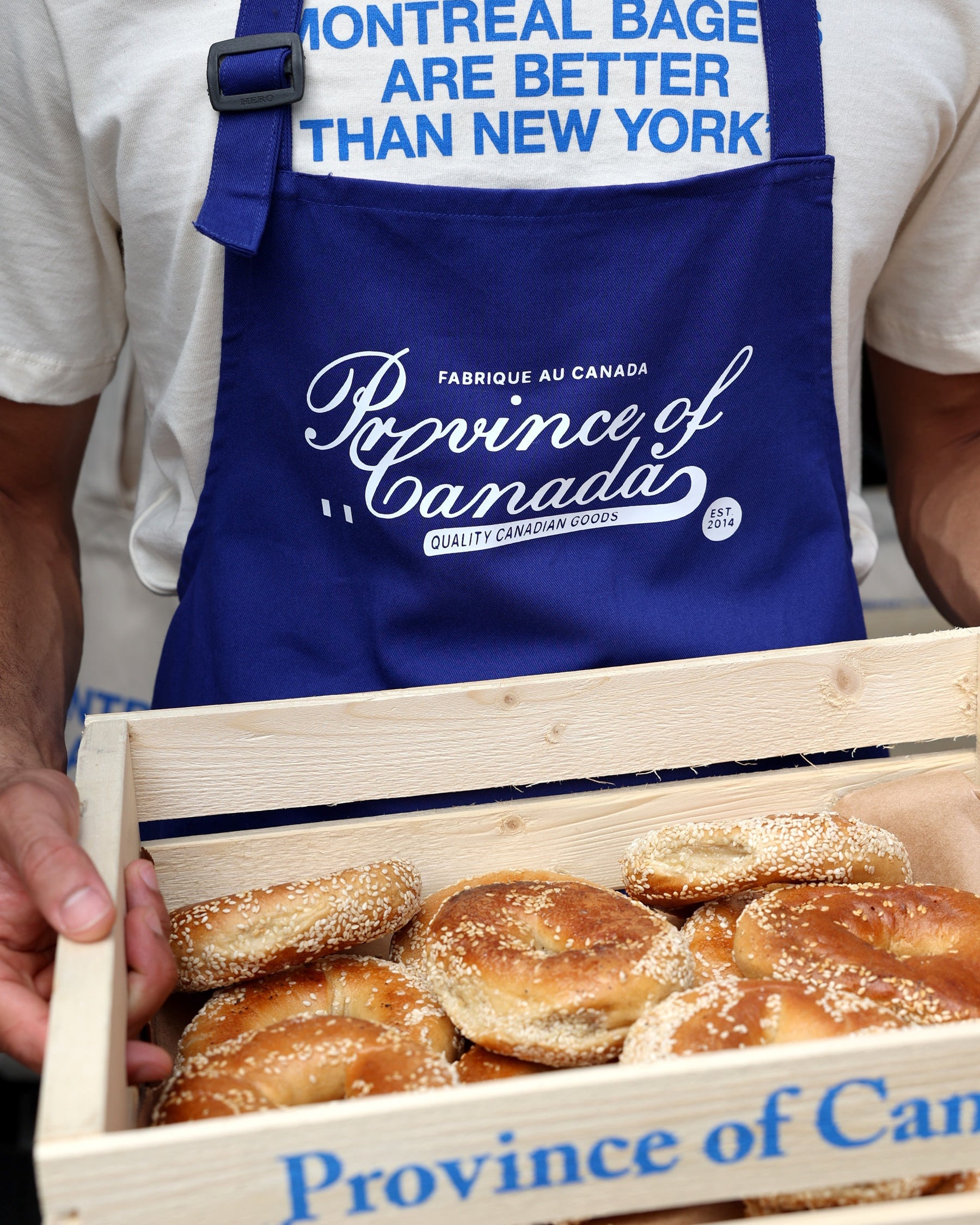 "This capsule collection is equal parts slogan tee trend, a quirky take on the whole ‘Elbows Up’ thing, and a shoutout to all the bakers keeping the tradition of Montréal Bagels alive — we salute you."