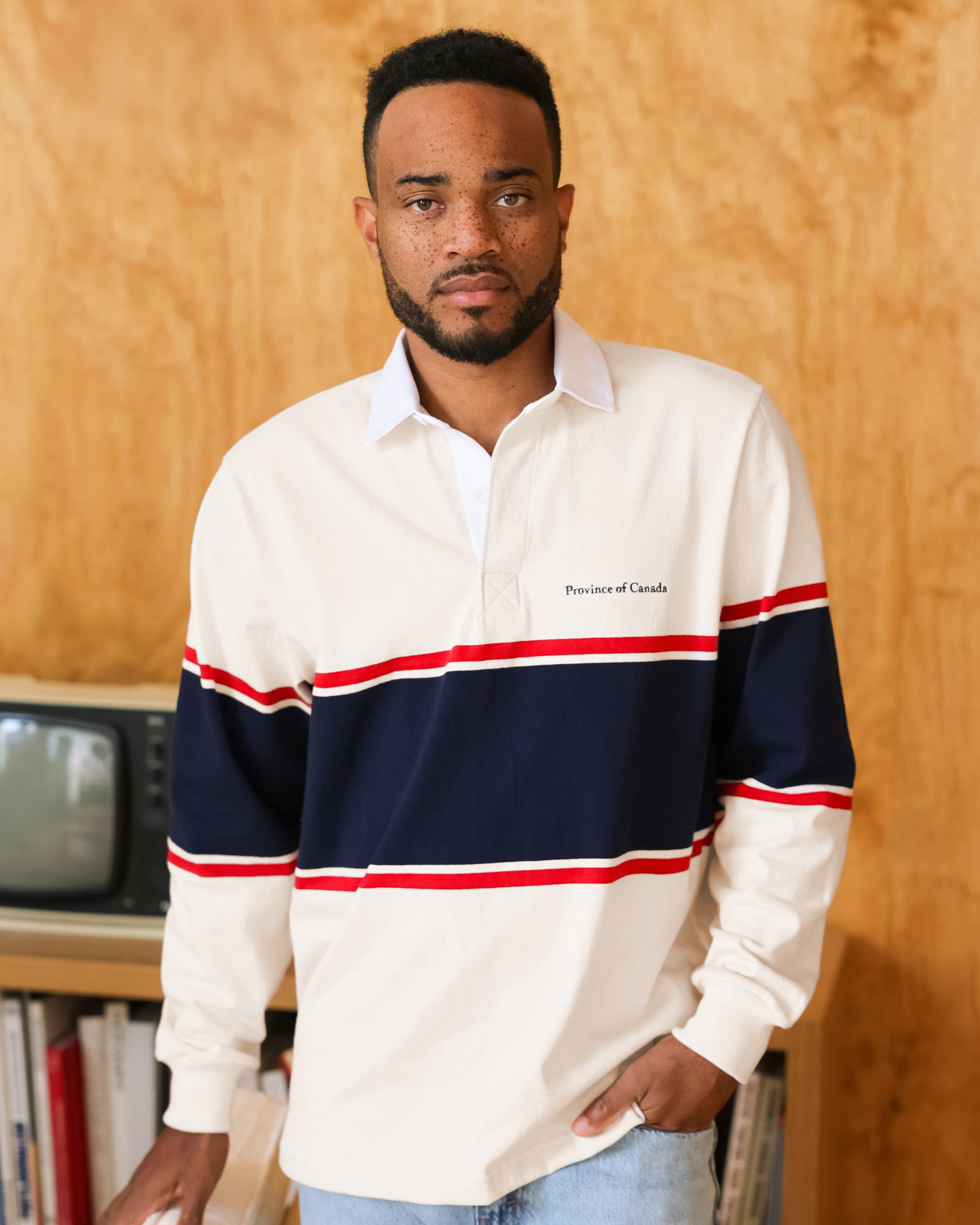 Our Rugby Shirt is made with thick, high quality, 100% cotton knitted in Canada. Its weight creates a structured but comfortable silhouette that will never lose its shape. We’ve finished it with a white contrasting collar and a clean button closure. Welcome to 'Casual Canadian Prep'.